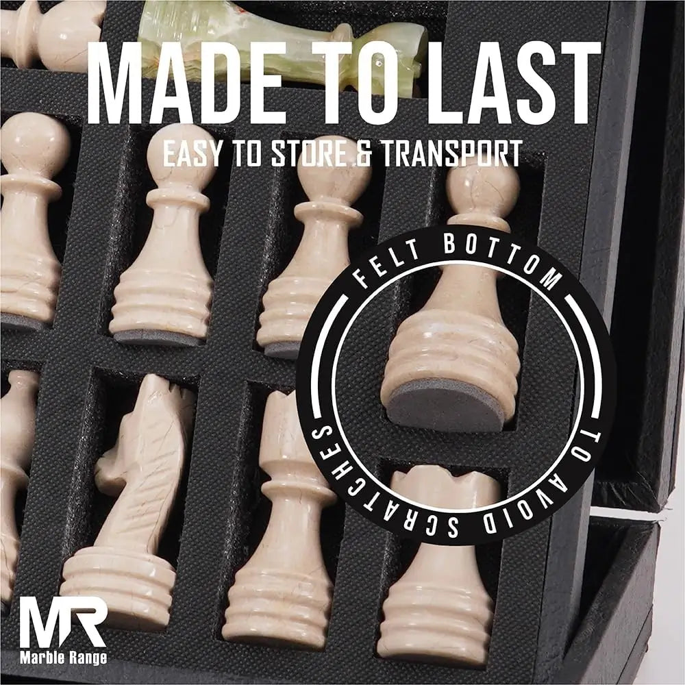 - Includes everything you need: 1 x marble chess board, 32 x chess pieces, plus 2 extra queens for advanced gameplay. You’ll receive 2 Kings, 2 Queens, 4 Knights, 4 Bishops, 4 Rooks, and 16 Pawns — all stored safely in a Marble Range branded storage box with secure fragile packaging.