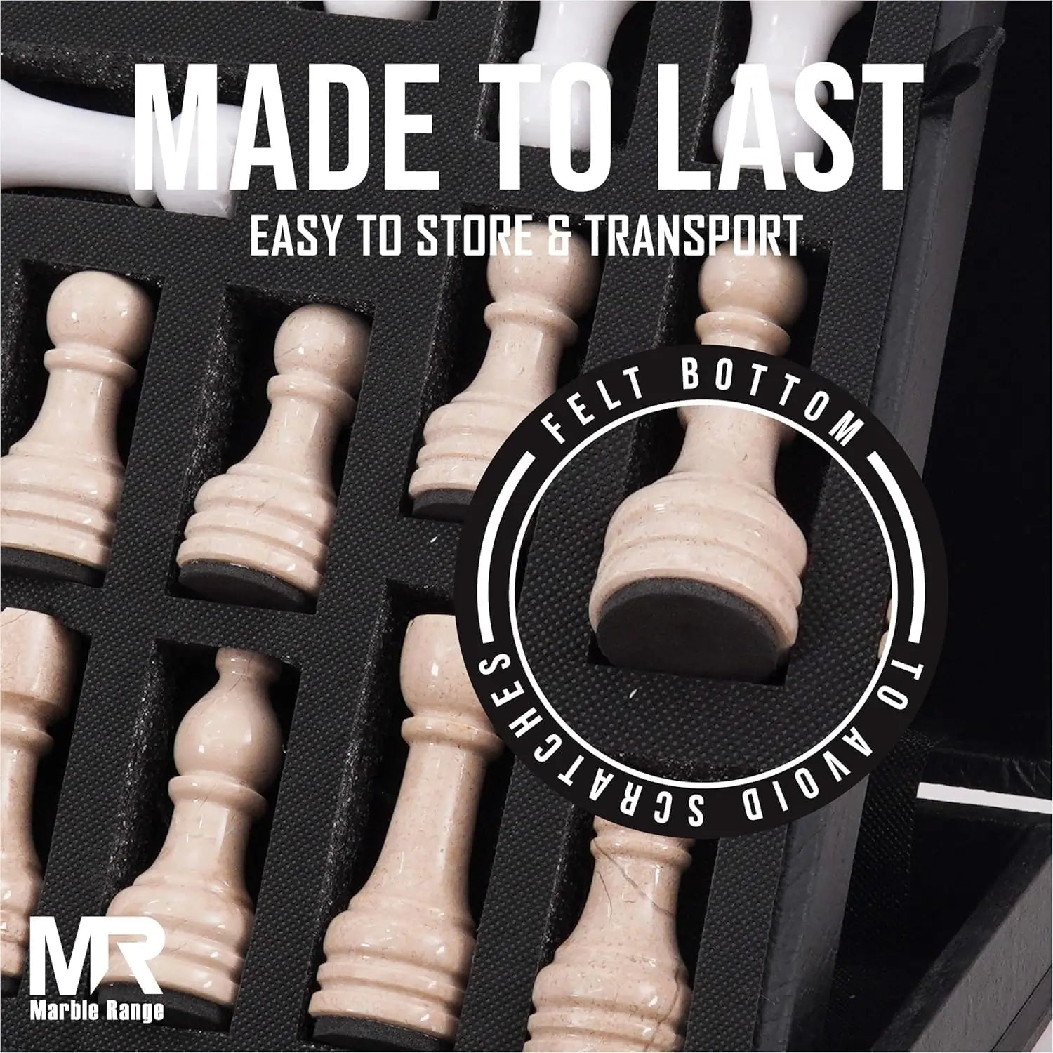 - Includes everything you need: 1 x marble chess board, 32 x chess pieces, plus 2 extra queens for advanced gameplay. You’ll receive 2 Kings, 2 Queens, 4 Knights, 4 Bishops, 4 Rooks, and 16 Pawns — all stored safely in a Marble Range branded storage box with secure fragile packaging.